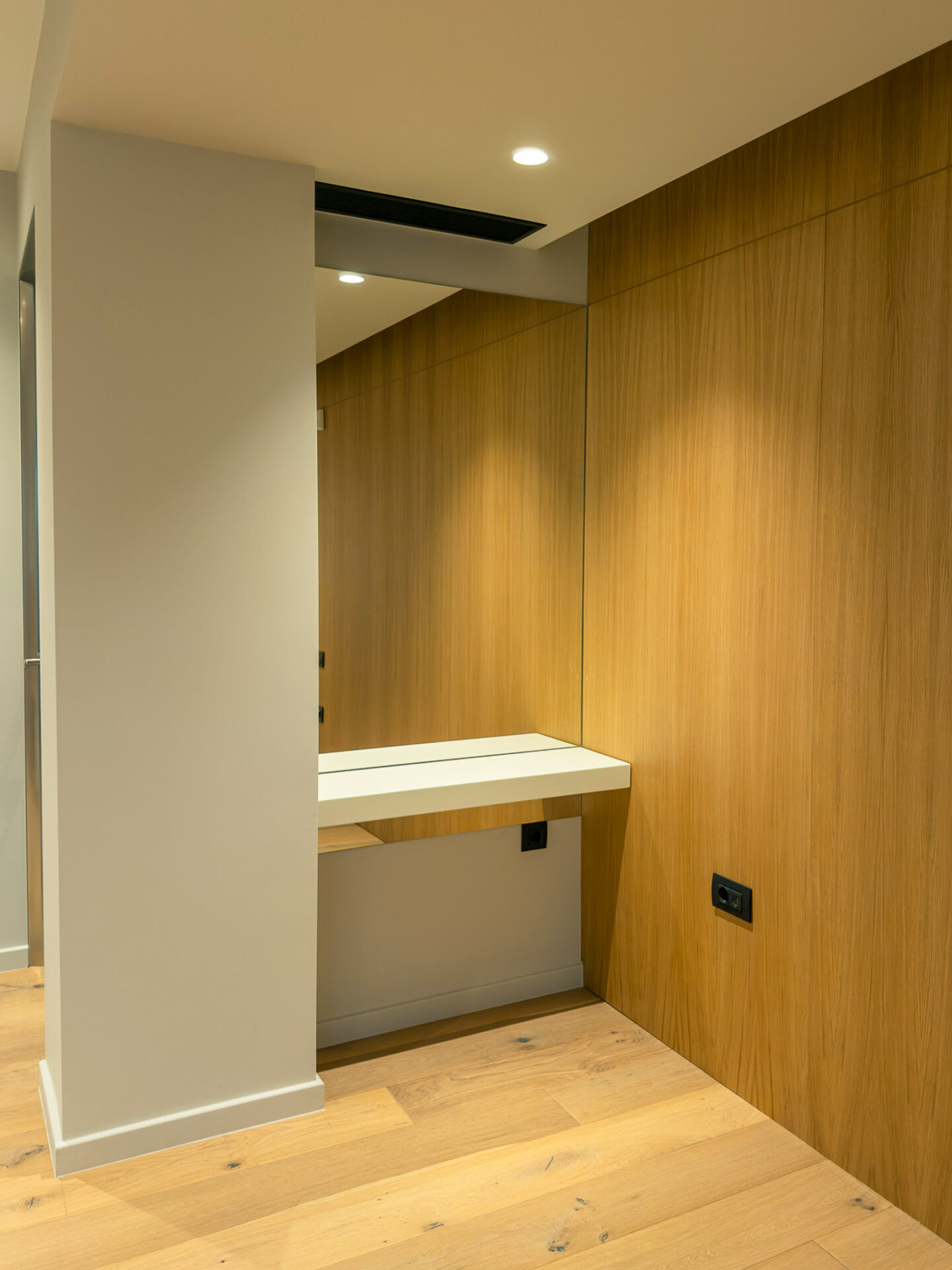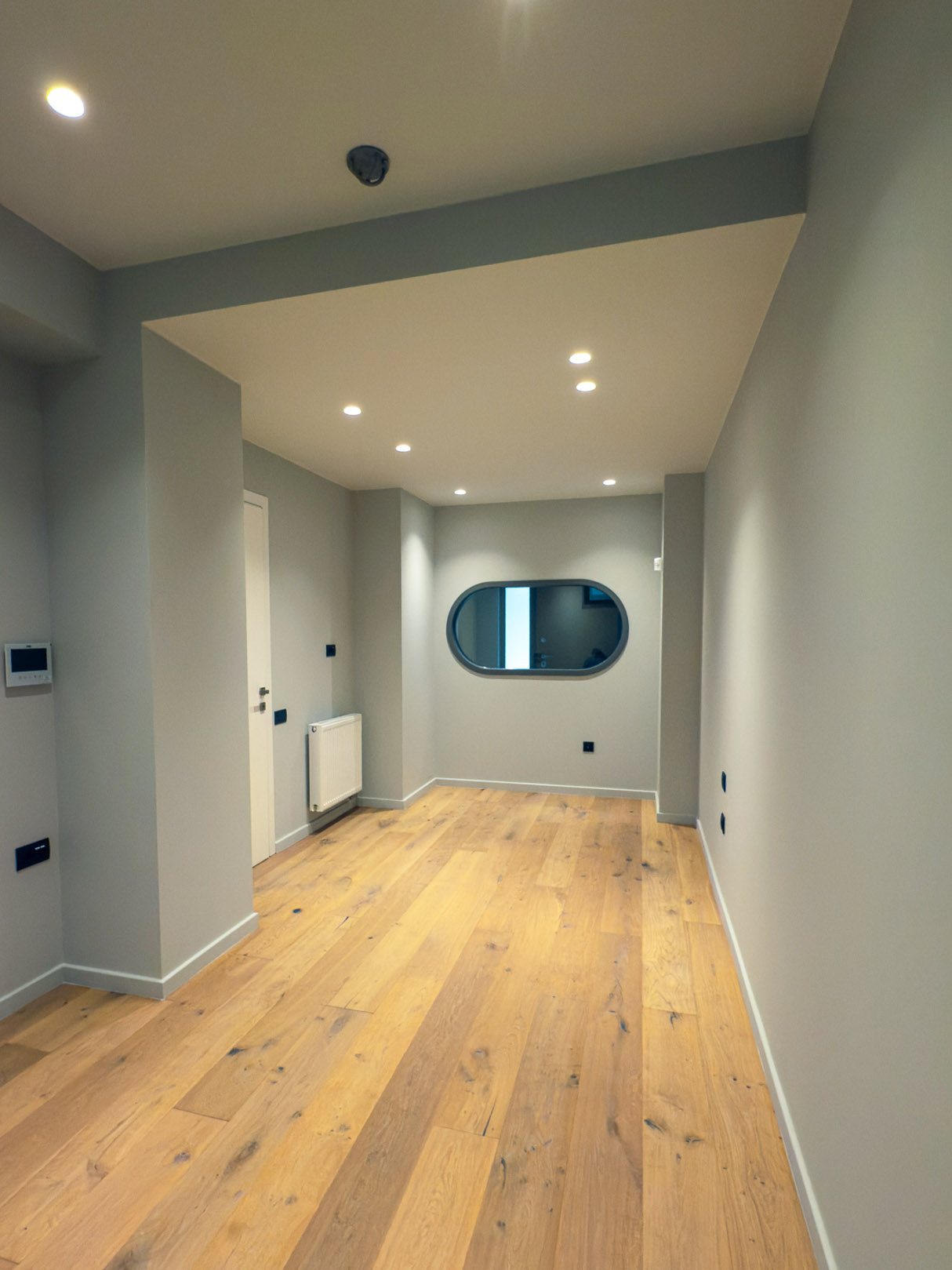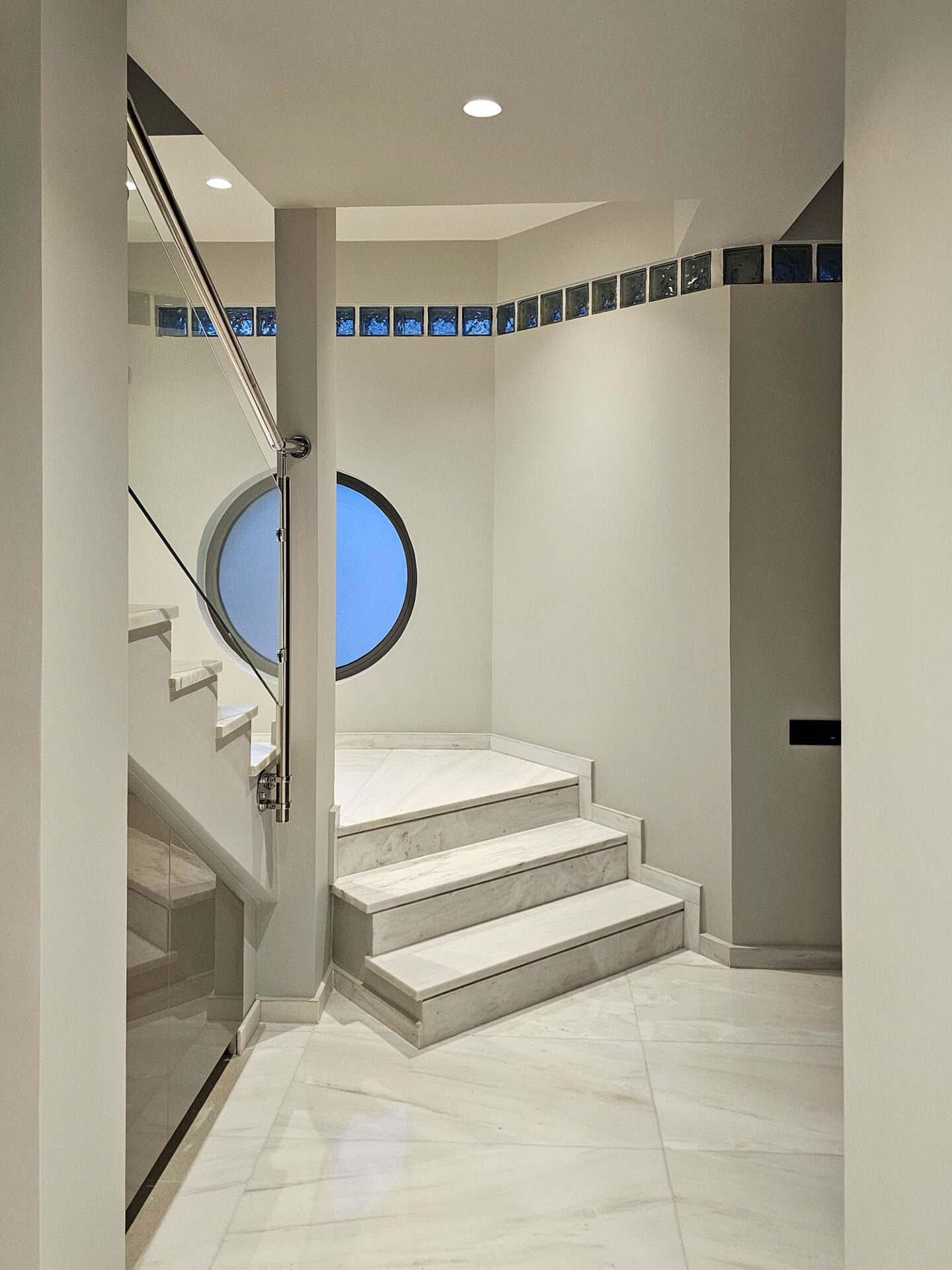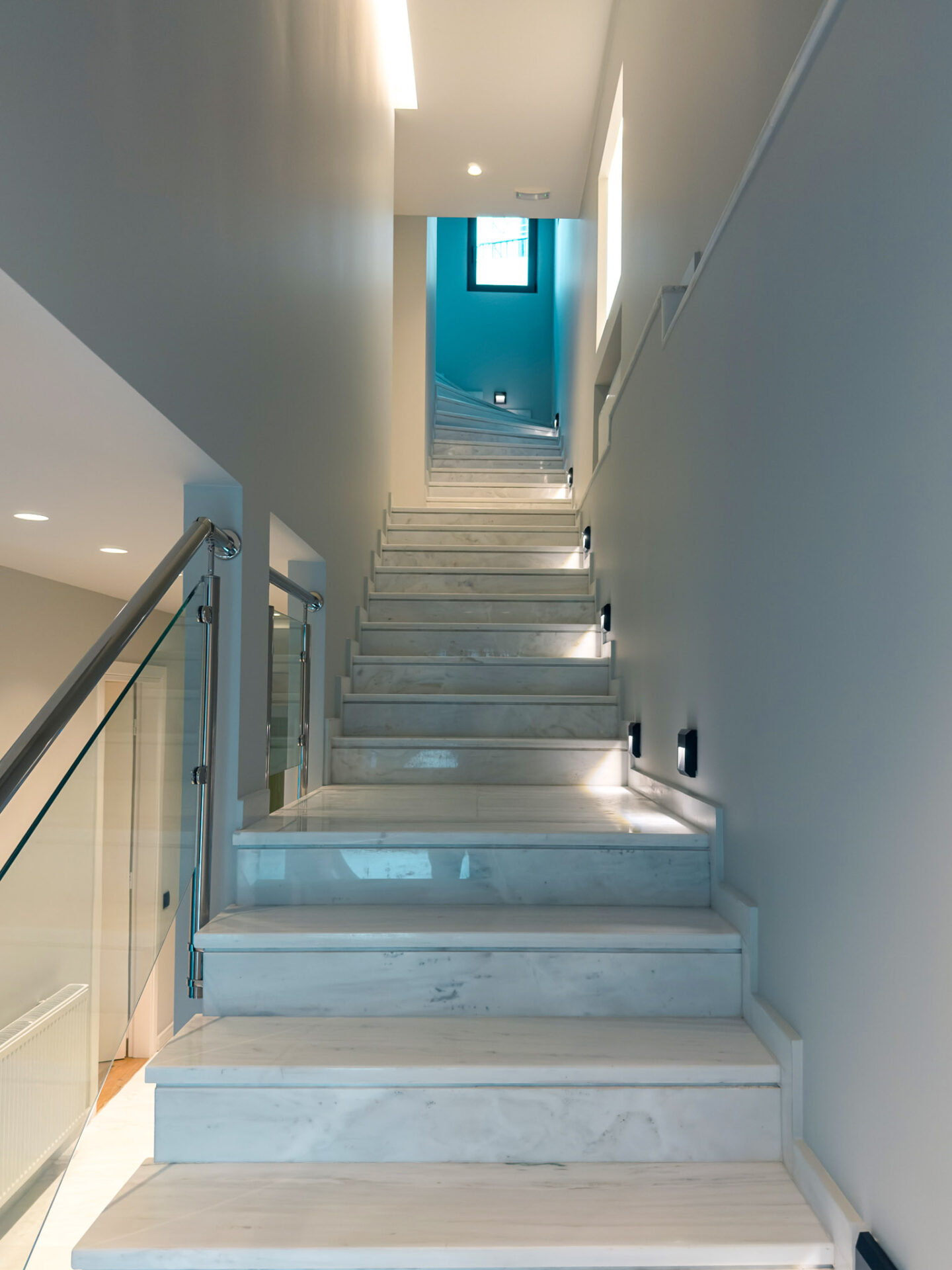 Η είσοδος της κατοικίας επενδύεται με λευκά μάρμαρα, προσδίδοντας μία αίσθηση κομψότητας και διαχρονικότητας. Όλα τα επίπεδα συνδέονται με ανελκυστήρα, εξασφαλίζοντας πλήρη προσβασιμότητα. Τα κουφώματα είναι τελευταίας τεχνολογίας, προσφέροντας ενεργειακή αποδοτικότητα, θερμομόνωση και ηχομόνωση.