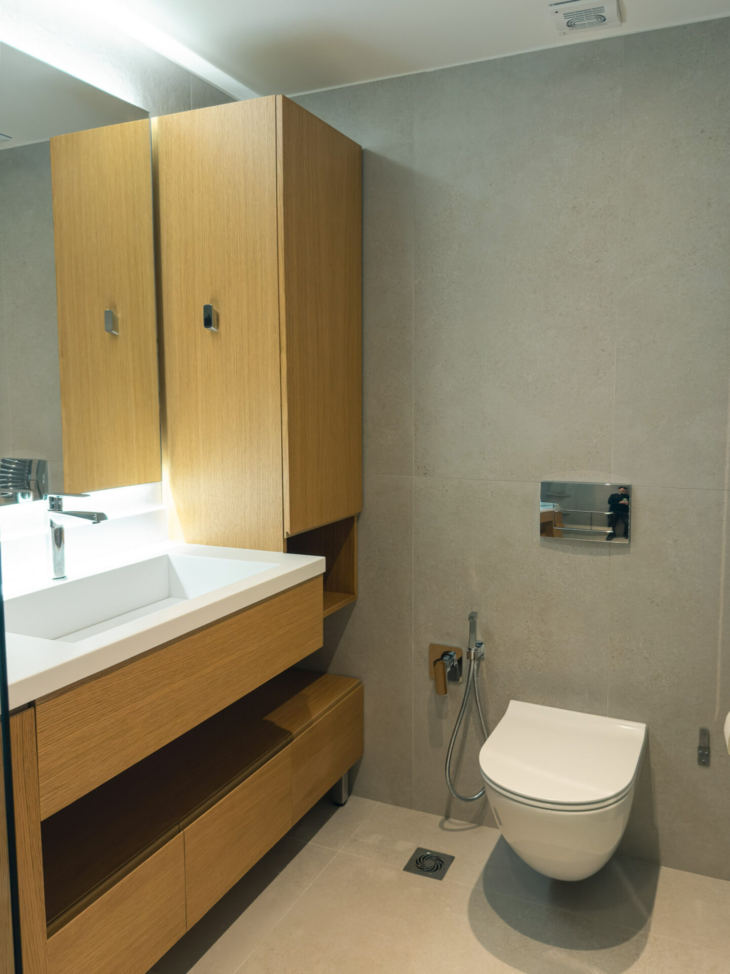 Στο κατώτερο επίπεδο βρίσκονται οι βοηθητικές χρήσεις: ένας κλειστός χώρος στάθμευσης, μια μικρή ανεξάρτητη γκαρσονιέρα και χώροι αποθήκευσης. Το επίπεδο της κύριας ιδιωτικής ζώνης περιλαμβάνει τα υπνοδωμάτια, ένα γραφείο, καθώς και έναν μικρό ενιαίο χώρο κουζίνας και καθιστικού με έξοδο στην πίσω αυλή. Τα υπνοδωμάτια έχουν πρόσβαση σε μπαλκόνι με θέα προς τον δρόμο. Το κύριο υπνοδωμάτιο διαθέτει ιδιωτικό λουτρό και δωμάτιο-ντουλάπα, ενισχύοντας την αίσθηση άνεσης και αυτονομίας.