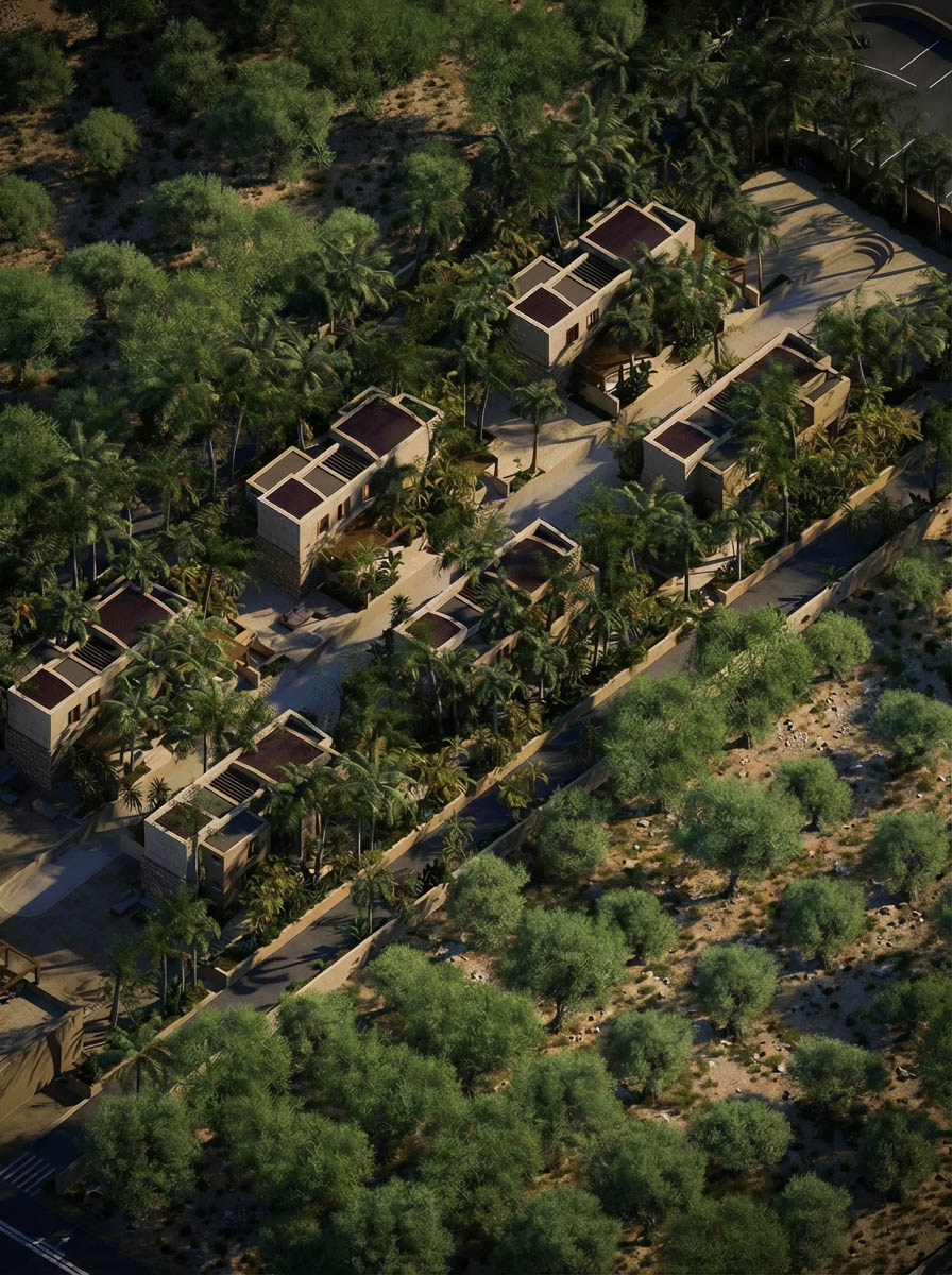 Η καρδιά του συγκροτήματος είναι ο «τεχνητός ποταμός», μια πισίνα ultra-length που διατρέχει όλο το μήκος των εγκαταστάσεων. Οι σουίτες είναι τοποθετημένες έτσι ώστε να προσφέρουν άμεση πρόσβαση στο νερό, καταργώντας τα όρια μεταξύ εσωτερικού και εξωτερικού χώρου. Καθαρές γεωμετρίες από εμφανές σκυρόδεμα και ζεστές λεπτομέρειες φυσικής δρυός συνθέτουν μια ατμόσφαιρα εκλεπτυσμένου μινιμαλισμού.