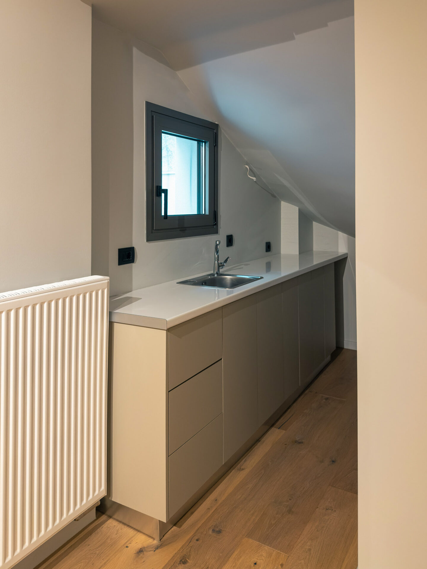 This private residence is located in the coastal neighborhood of Kastella, within a quiet urban setting that retains a strong connection to the sea. The building is developed across three levels and was designed with a clear emphasis on functionality, spatial clarity, and integration with the outdoor environment.