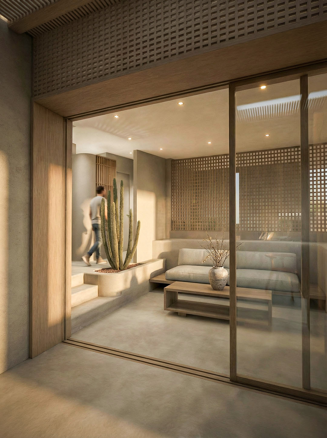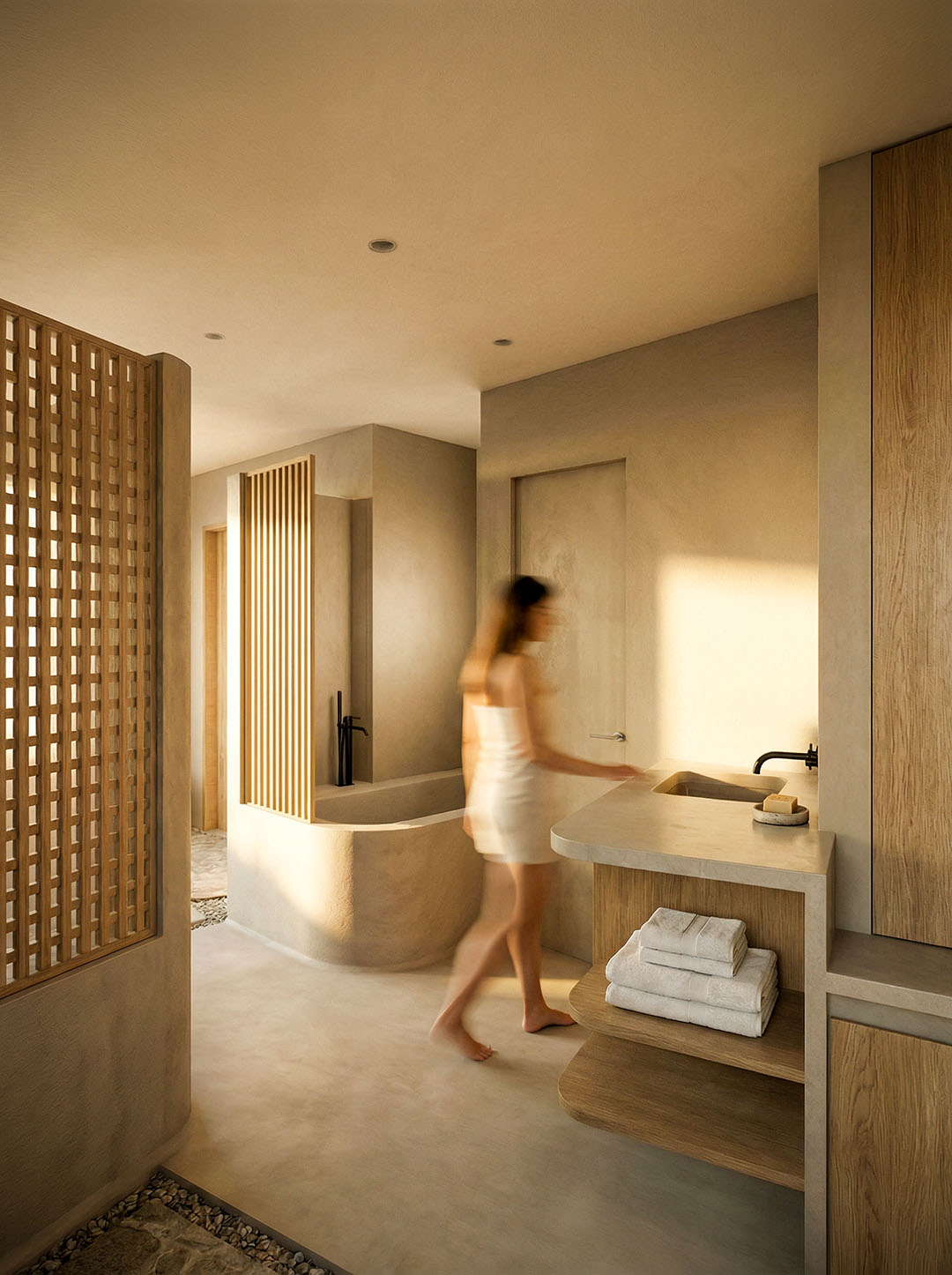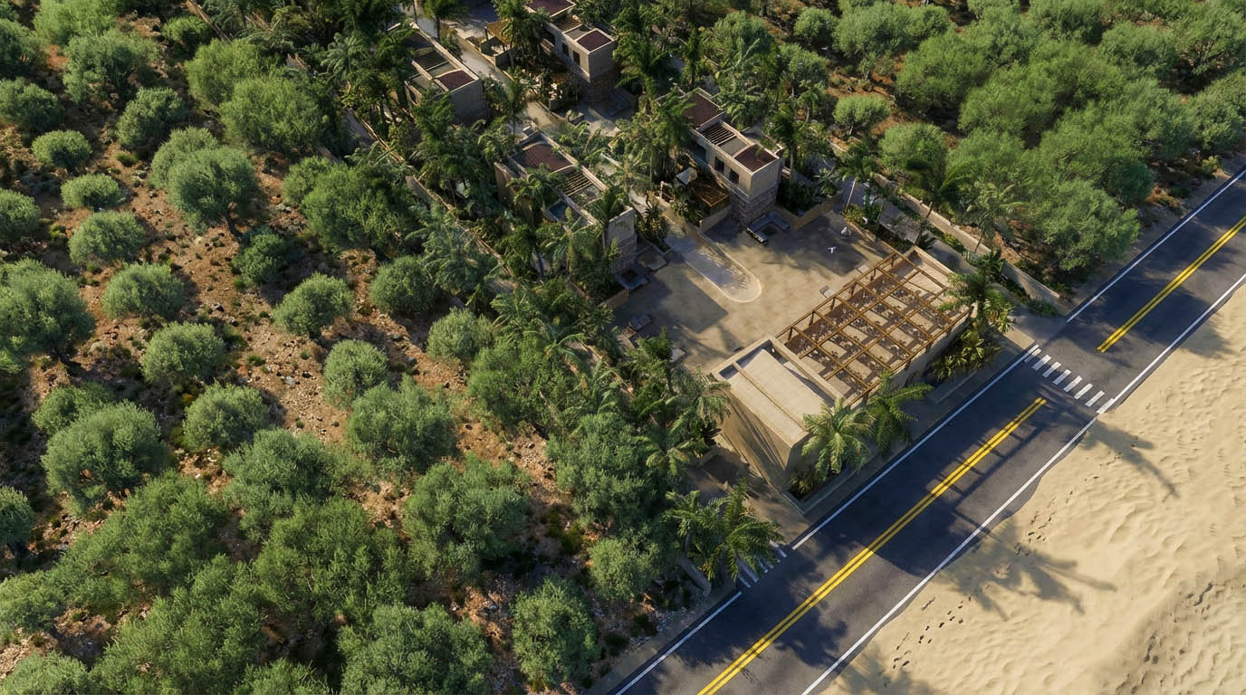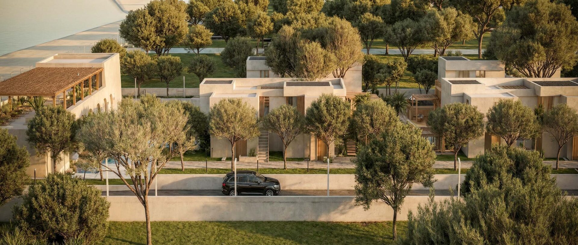 The heart of the complex is the “artificial river” — an ultra-length pool that runs along the entire development. The suites are positioned to offer direct access to the water, dissolving the boundaries between indoor and outdoor space. Clean geometries in exposed concrete and warm details in natural oak create an atmosphere of refined minimalism.