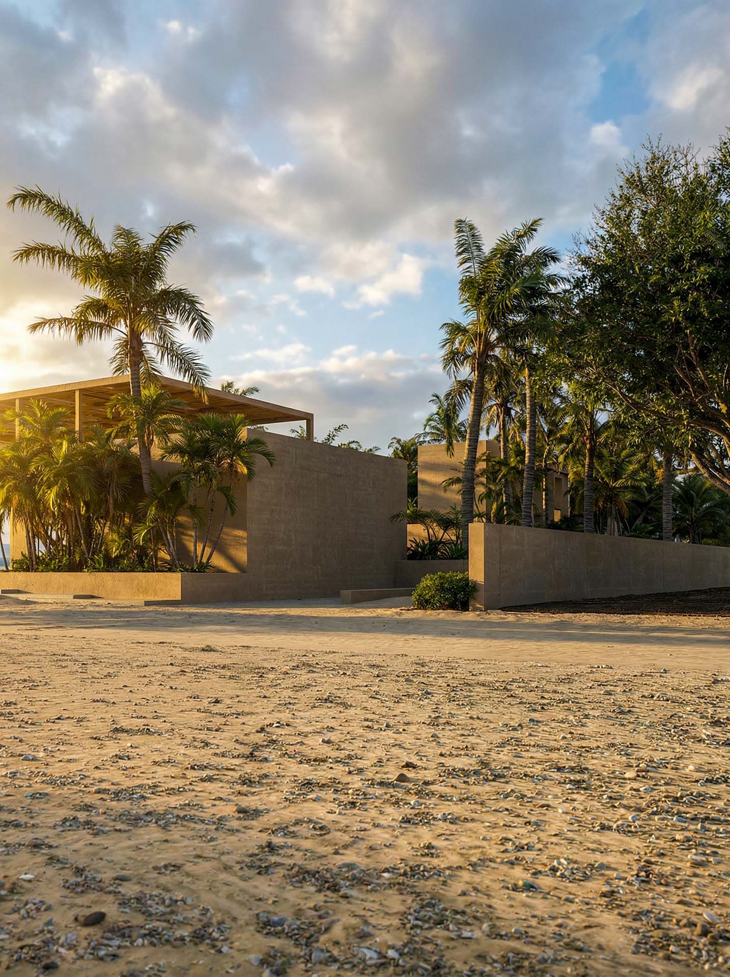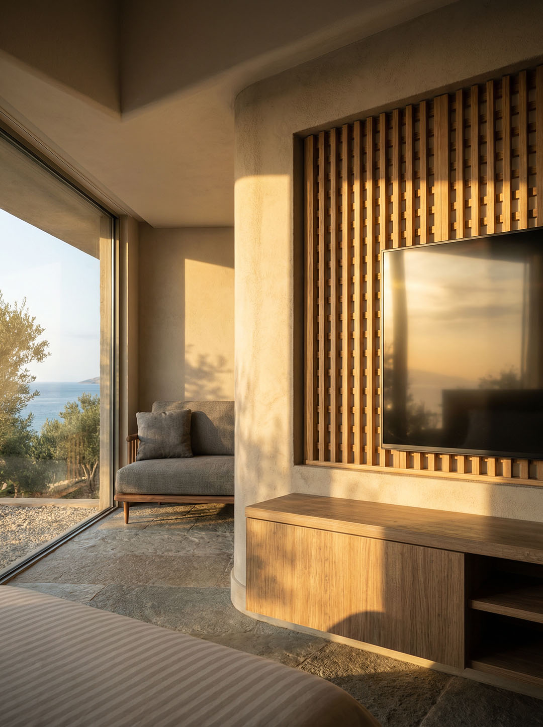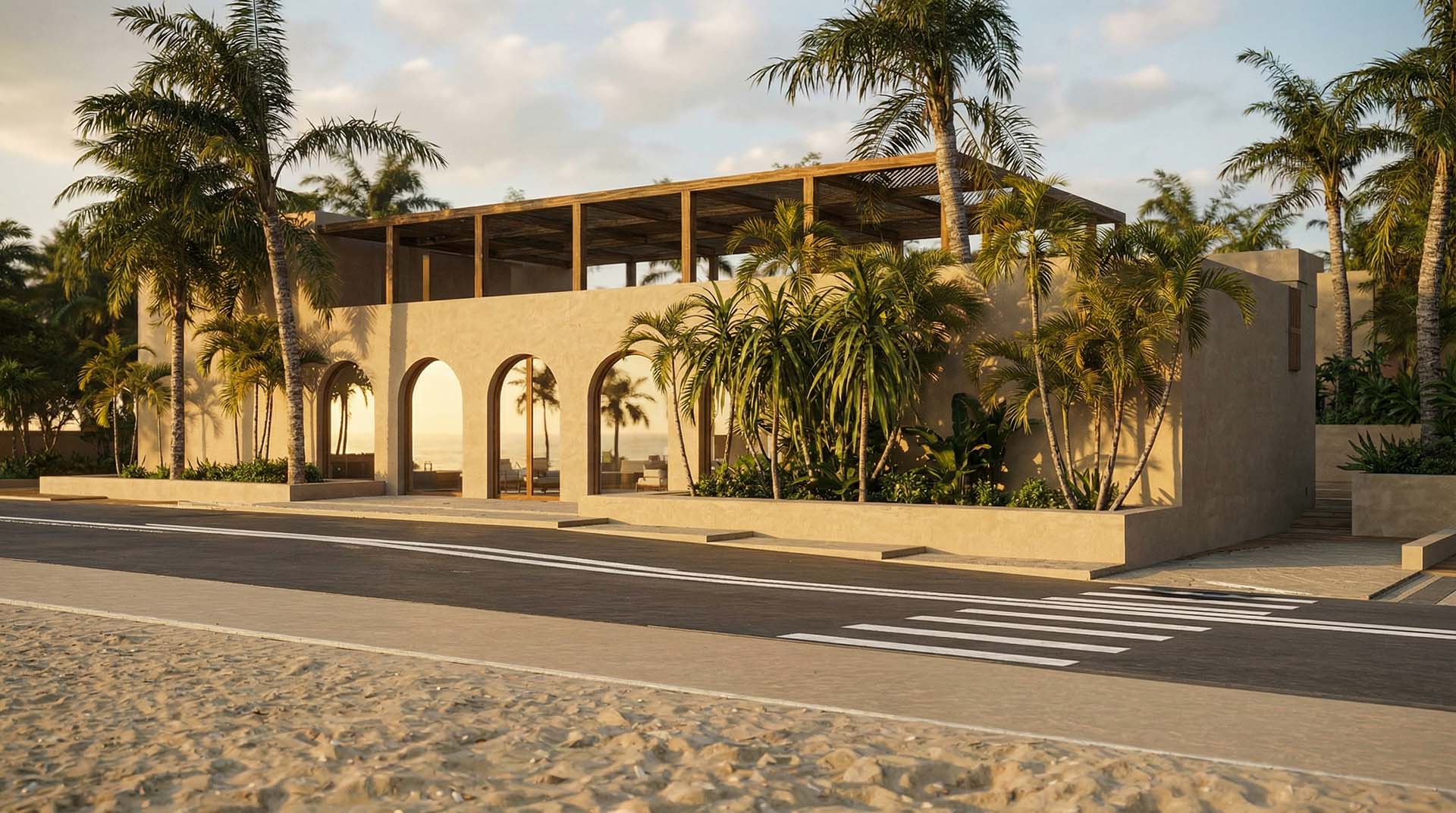 The heart of the complex is the “artificial river” — an ultra-length pool that runs along the entire development. The suites are positioned to offer direct access to the water, dissolving the boundaries between indoor and outdoor space. Clean geometries in exposed concrete and warm details in natural oak create an atmosphere of refined minimalism.